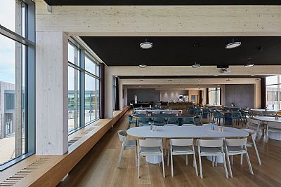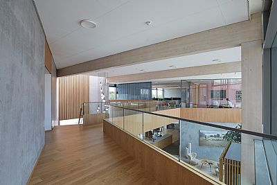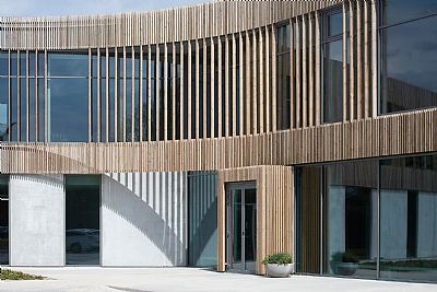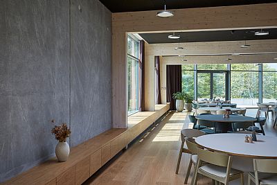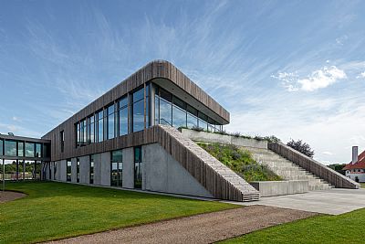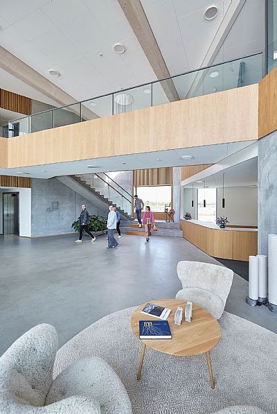 The new office building strongly focuses on climate-friendliness, reflecting the company's focus on a sustainable profile and products. The construction of the two-storey office building primarily consists of timber frames. The building is curved to create a connection to the park and nature at one end of the building. In the kink of the building, the entrance to the house is established in a double-height foyer, from which you can move to all sections of the building. A showroom, office functions, and a sewing room are based on the ground floor. On the first floor are meeting rooms and an event hall with a full-width external staircase, connecting directly to the landscaped park with natural vegetation focusing on biodiversity and a fully integrated rainwater basin.