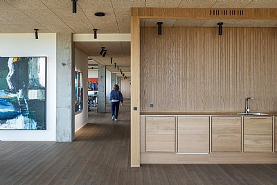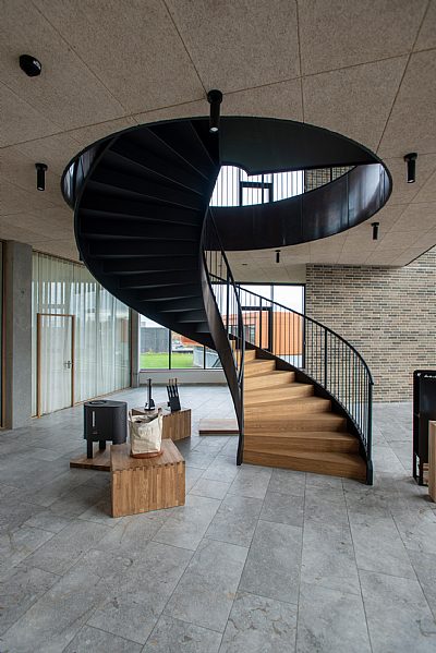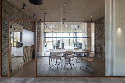 Materialevalget er enkelt og holdbart med tegl, natursten, tombak, beton og egetræ, der alle patinerer smukt. Den centrale dobbelthøje ankomsthal forbindes via en skulpturel spindeltrappe og leder til showroom, møderum, kantine og arbejdsområder. Øverste etage hæver sig over lageret og giver 360 graders udsigt, og mod syd åbner en stor tagterrasse med udepejs sig op som en social oase.