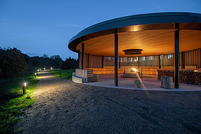 Som to cirkelformede strukturer udgør pavillonen og bålhytten et enestående udemiljø, der er smukt integreret i det bølgende landskab.
