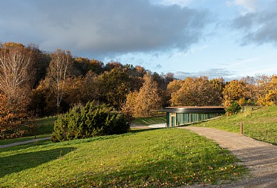 Glaspavillonen, nedsænket i det skrående terræn, prydes af et grønt sedumtag og fungerer som indbydende loungerum. Pavillonen ligger som en harmonisk forlængelse af naturen, hvor skydedøren i glas åbner for en flydende overgang mellem ude og inde.