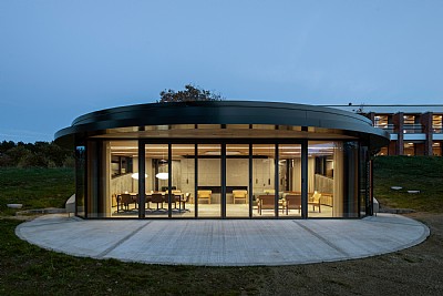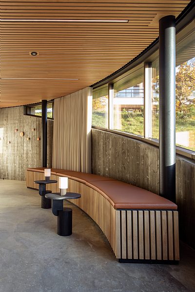 Pavillonen, fungerer som en hyggelig lounge midt i det grønne og danner rammen for events, kursus- og mødeaktiviteter. En nordisk atmosfære præger interiøret med insitustøbt betongulve og vægge beklædt med taktile egetræslister. Pejs og C.F. Møller Architects’ lysarmaturer fra Yoyo fuldender rummet og inviterer gæster ind i en varm, nordisk oase.