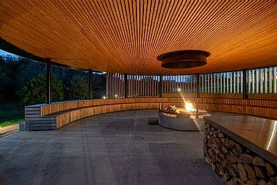 Som to cirkelformede strukturer udgør pavillonen og bålhytten et enestående udemiljø, der er smukt integreret i det bølgende landskab.