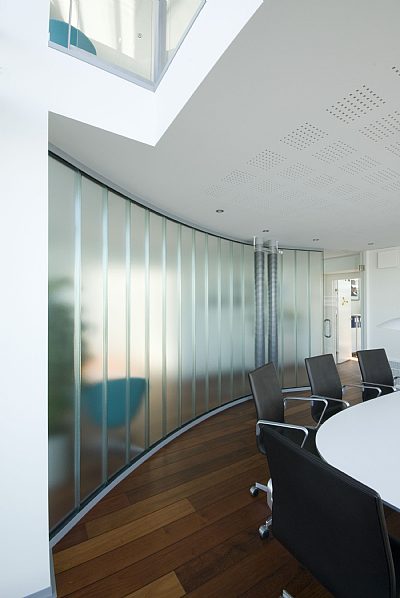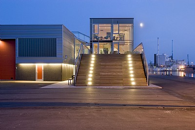 Bygningen er trods sin ringe størrelse udformet i tre etager for at nyde mest muligt af den fantastiske beliggenhed og udsigt. Som et fælles gode ligger på 1. sal en stor tagterrasse (’skibsdækket’), som afsluttes i et stort trappeparti med panoramablik til Aarhus Bugt. Chefkontorerne på første sal er udstyret med en egen, svævende udsigtsbro i det dobbelthøje rum.