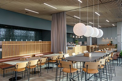 Opgaven for IT/tech-hubben i Katrinebjerg, med et netværk på over 100 virksomheder, begyndte med en indledende analyse af funktionalitet, flow, zonering og wayfinding og blev afsluttet med en komplet indretningsløsning med fokus på farver, materialer, møbler og specialinventar til alle fællesområder — herunder atrium, reception, restaurant, møde- og eventfaciliteter samt mindre fælleszoner som tekøkkener og lounges.