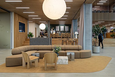 Indretningen bidrager til den samlede arkitektoniske identitet ved at skabe et venligt og åbent fællesskabsrum på Katrinebjerg — et sted, hvor mennesker mødes, studerer, samarbejder og udveksler idéer. Indretningen refererer til lokal designtradition ved at integrere møbler og belysning fra Aarhus-baserede producenter.