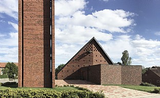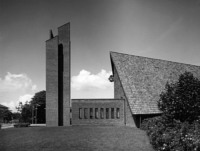 Menighedskirke og sognegård i det nordlige Aarhus. Den karakteristiske kirkebygning er solidt forankret i de gamle danske og nordiske traditioner med tegl og træ som de gennemgående materialer. Kirkerummet, der domineres af tagets to store flader med de synlige træspær, giver med sin prismeform en naturlig ramme om koret med døbefont, alter og prædikestol. Det understreges af det bløde, skiftende lys fra det store runde vindue i taget mod syd og giver en rolig og sluttet ramme om de kirkelige handlinger. Det rene og enkle kirkerum er på samme tid jævnt og opløftende. Det faldende terræn på grunden gjorde det muligt at indrette kirkens underetage, krypten, med menighedslokaler, konfirmandstue og kontor. Kirken blev opført i 1958, mens C.F. Møller var Kongelig Bygningsinspektør i Aarhus.
