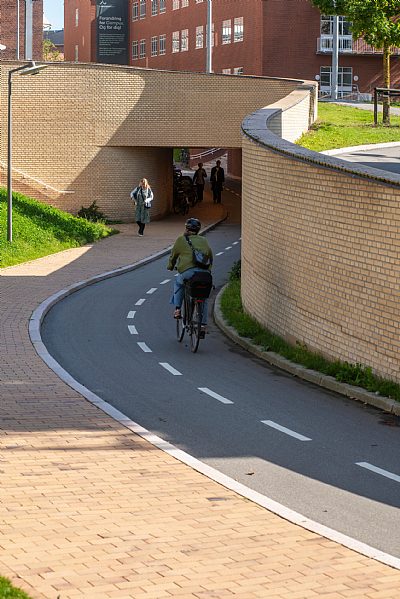 Med en enkel gestus omslutter de bølgende teglmure fodgænger- og cykelstien, som snor sig under Nørrebrogade. Teglmurerne falder i højde efterhånden som tunnelen integrerer sig med terrænet i Universitetsparken og den nye Universitetsby, hvor ruten kobler sig til nye og eksisterende stisystemer og slynger sig naturligt ind i det bakkede terræn. Fra Universitetsbyen er der også adgang til tunnelen via brede trapper med buede værn i tegl.