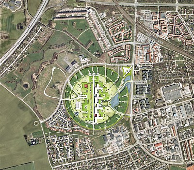 Grønne omgivelser, rigeligt med dagslys, gårdhaver, grønne tage og udsigt er vigtige elementer i tanken om helende arkitektur. Således tilføres det oprindelige landskab - den karakteristiske, ringformede skov, der omkranser hospitalet – søer, vandløb og beplantning, og de nye sengestuer har alle udsigt til landskabet vestover eller Køge Bugt.