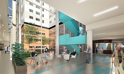 Universitetssygehuset bevarer den nuværende vandrehal som hovedfærdselsåre og udvider derfra med fire vertikale transportveje. Hver transportvej har tilknyttet et torv med hver sin gårdhave, og det gør det nemt at orientere sig for både patienter, pårørende og personale.