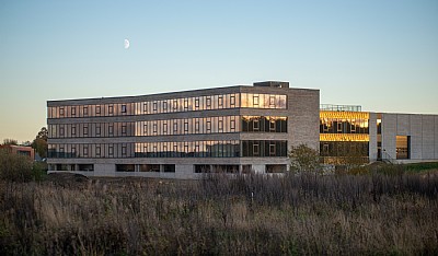 Facaden er lavet af genanvendt anodiseret aluminium i en dæmpet grøn nuance, der supplerer skovens farve og fremhæver de varme toner. Bygningen bruger et modulært design, der letter hybridtræ i de fleste dele af konstruktionen. Bygningens interne rumlige og strukturelle organisation er baseret på ideen om at kombinere tre identiske kontorzoner, samlet af en samlet facade, der strækker sig langs hele bygningen. Facadesystemet bidrager med flere fordele såsom energibesparelser ved at bruge solafskærmning og naturlig ventilation, minimere støj og forurening og vigtigst af alt et godt indeklima med tilstrækkelig dagslys og akustiske forhold, der rummer et behageligt arbejdsmiljø.