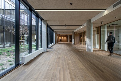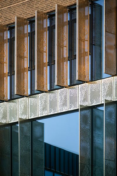 Special attention has been paid to daylight, acoustics and indoor climate, ensuring a healthy and pleasant working environment. The façade design responds to the sun’s path, and perforated tombac shutters reduce overheating while creating a vibrant play of light and shadow. The landscape design around a sunken courtyard adds greenery and a sense of calm to the daily work environment.