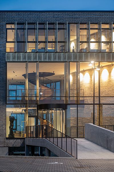 The material palette is simple and durable – brick, natural stone, tombac, concrete, and oak – all of which age beautifully. A central double-height arrival hall, connected by a sculptural helical staircase, leads to the showroom, meeting rooms, canteen, and workspaces. The top floor rises above the warehouse, offering 360-degree views, while a large south-facing roof terrace with outdoor fireplace creates a social oasis.
