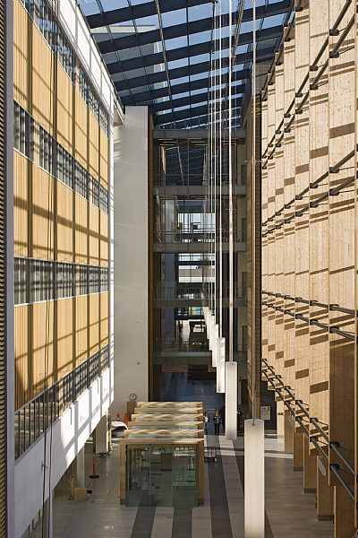 Die verschiedenen Krankenhausabschnitte sind auch hinsichtlich Dimensionen, Form und Ausdruck unterschiedlich gestaltet. Bettenflügel, Behandlungsbau und Kinderklinik unterscheiden sich in ihrem architektonischen Ausdruck und haben jeweils ihren ganz eigenen Stil. Damit entsteht ein abwechslungsreiches visuelles Erlebnis, das gleichzeitig auch die Orientierung erleichtert. Eine wichtige Rolle bei diesem Bauvorhaben spielen die Lichtverhältnisse – Tageslicht für alle Arbeitsplätze –sowie Aussicht auf die Landschaft und Kontakt zum Außenbereich. Ein Magistrale mit Glasdach verbindet die verschiedenen Gebäude und Funktionen miteinander.