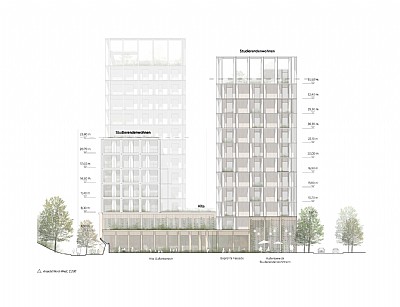 Der Masterplan des Bildungscampus West entwickelt entlang des Neckarufers eine dichte, urbane Campusstruktur mit hohen Zielsetzungen an nachhaltige Entwicklung, moderne Infrastruktur, qualitätsvolle Architektur und grüne Stadträume sowie menschlichen Maßstab. In dem nord-westlichen Campusteil ist am Neckar eine Zeilenbebauung vorgesehen, die der Entwurf weiterführt und um zwei standortdefinierende Hochpunkte ergänzt.