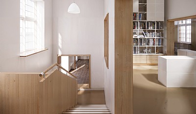 The actual design studio occupies coherent open storeys, linked by a single long, sculptural stairway that passes through all the storeys.