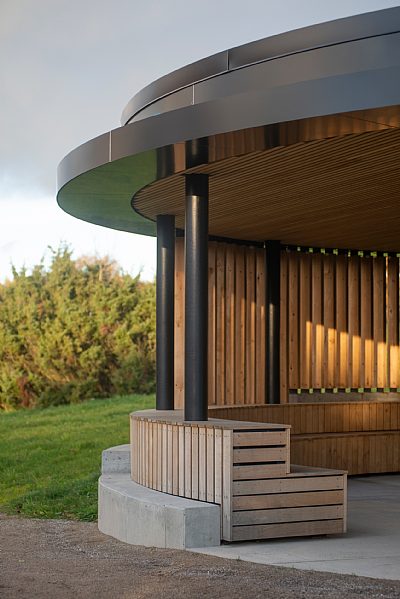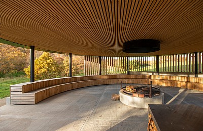 Als zwei kreisförmige Bauwerke bilden der Pavillon und die Feuerstelle einen einzigartigen Außenbereich, der sich wunderbar in die hügelige Landschaft einfügt.