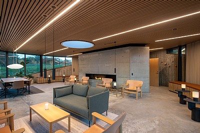 Der Pavillon dient als gemütliche Lounge mitten im Grünen und bietet den Rahmen für Veranstaltungen, Kurse und Konferenzen. Eine nordische Atmosphäre prägt den Innenraum mit Ortbetonböden und Wänden, die mit taktilen Eichenleisten verkleidet sind. Ein Kamin und C.F. Møller Architects' Yoyo-Leuchten vervollständigen den Raum und laden die Gäste in eine warme, nordische Oase ein.