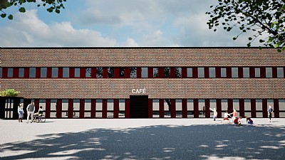 Künstlerische Elemente feiern die Geschichte des Gebäudes und verleihen ihm gleichzeitig einen modernen Charakter. Das bestehende Vordach wird schwarz gestrichen, und die Dachflächen wechseln sich zwischen geschlossenen, offenen, durchscheinenden und begrünten Lösungen ab. Wiederverwendete Ziegel bilden Pflanzkästen um Säulen und Bänke entlang der Fassade, während Glasfelder in der freigelegten Ziegelmauer einen Dialog zwischen Erhalt und Innovation schaffen.