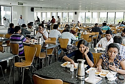 The trees help to screen off the sharp sunlight which pours in, filtered via the horizontal window strips, to illuminate the offices in this modernist building with its white-plastered concrete facade - the obvious choice of materials for FLSmidth, the world's leading supplier for the concrete industry. The building - and a later extension of the facilities - holds around 2,500 IT workplaces, together with a common canteen and conference rooms. It is one of the first buildings in India to achieve the Indian Green Building Council’s LEED India for New Construction Gold Certificate.