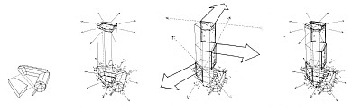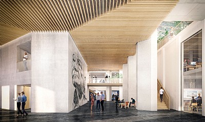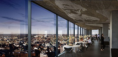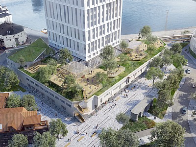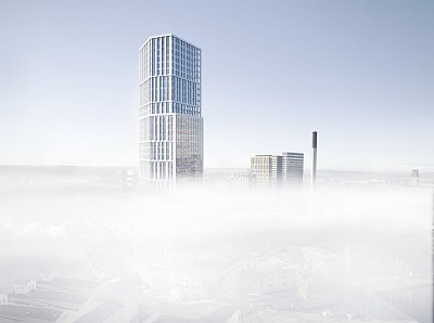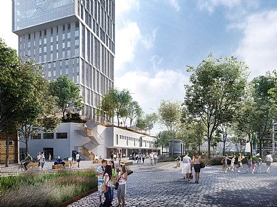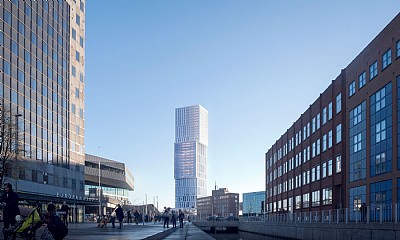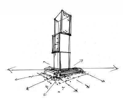 Der Turm selbst ist als helles und schlankes, skulpturales Wahrzeichen konzipiert, das mit vertikalen grünen Foyers sowohl den näheren als auch den weiteren städtischen Kontext ergänzt. Die Fassaden bestehen aus einem räumlichen Relief aus hellem Terrazzo, dessen Form sich an der Sonneneinstrahlung orientiert. Der Fokus liegt dabei auf optimalen Tageslichtverhältnissen, guten Ausblicken und einem gesunden Raumklima. Die Gebäudegeometrie orientiert sich nach allen Seiten und erzeugt so eine charakteristische und strukturell geprägte Wirkung auf mehreren Ebenen.