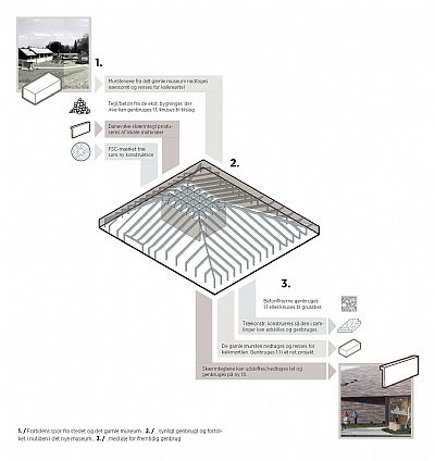 Große Teile des neuen Museumsgebäudes bestehen aus FSC/PEFC-zertifiziertem Holz sowie aus wiederverwendeten Baumaterialien des alten Museumsgebäudes und einer historischen Scheune aus dem Jahr 1864.