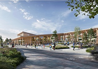 Der Bahnhofsbereich ist durch markante Holzkonstruktionen, grüne Verbindungen und strategisch platzierte Aktivitäten mit der Stadt verbunden. Die Architektur spiegelt die historische Handwerkskunst und die modernen Holzbautechniken wider, die das heutige Skellefteå prägen. Der horizontale Charakter des Daches interagiert mit der Vertikalität des bestehenden Holz-Hochhauses, Sara. Sichtlinien bleiben erhalten und verbinden die Stadt nördlich und südlich der Eisenbahn. Der Mobilitätsknotenpunkt im Osten und neue Wohn- und Bürogebäude im Westen definieren und rahmen den neuen Treffpunkt Skellefteås.