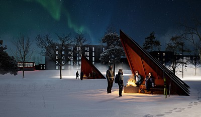Das Gebäude ist visuell mit der Stadt verbunden und bietet eine grüne und logische Reiseumgebung. Plätze und Parks sind von der Naturlandschaft Västerbottens inspiriert. Die leichte Holzkonstruktion des Gebäudes steht auf einem massiven Steinsockel und erinnert an einen zarten Kiefernwald auf schweren Felsen. Der Sockel bildet Stufen und Terrassen, die Innen- und Außenräume miteinander verbinden. Das Dach folgt der Topografie des Standorts, außer wo es ansteigt, um einladende Eingänge zu schaffen. Eine große Dachlaterne fungiert als Wahrzeichen, das direkt aus der Stadt sichtbar ist. Vor dem Gebäude bietet der Straßenraum Platz für Fußgänger, Radfahrer, Cafébesucher und umsteigende Reisende. Der historische Bahnhofspark wird in einen naturinspirierten Freiraum verwandelt, der das städtisches Leben und lokale Ökosysteme fördert.