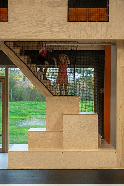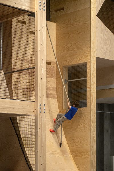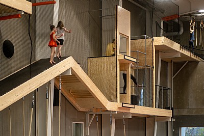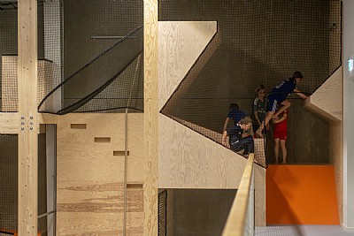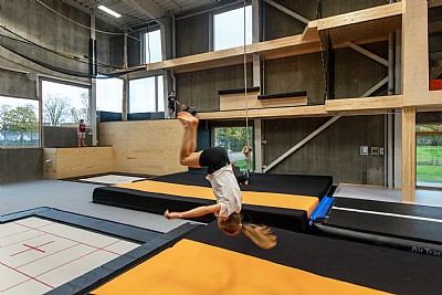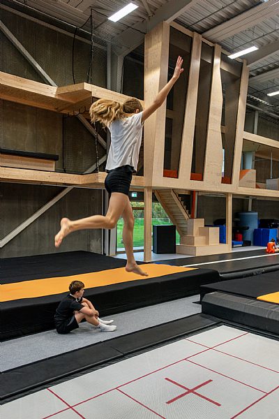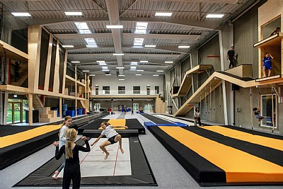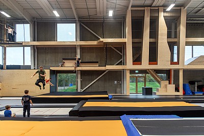 Das neue Gebäude bietet Räume für funktionelles Training, Rhythmus- und Hindernisparcours – inspiriert von „Ninja Warrior“ – sowie Vereins- und Aufenthaltsbereiche mit Umkleiden, Küche und Besprechungsräumen. Im Obergeschoss befinden sich neben der Rhythmushalle auch Büros und Gemeinschaftsbereiche mit Blick auf die umliegenden Sportaktivitäten. Die Außenbereiche sind über Aktivitätszonen, Aufenthalts- und Trainingsflächen entlang der Fassaden und des Eingangsbereichs in das architektonische Konzept integriert.
