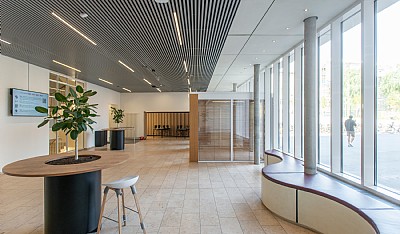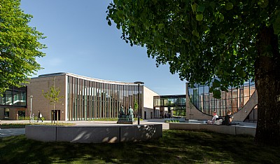 Outside the buildings, a large yellow square held in the same tiles as the façades functions as the unifying place for the visitors. The Auditorium’s main entrance and foyer connect the square on the one side of the building with the lake on the other via its large windows from floor to ceiling. Inside the foyer, the underside of the auditorium hangs visibly in the room and extends through-out the three floors. Its shape is reminiscent of the moraine formations in the park, while it also functions as the canvas for the enormous painting by the Danish artist Per Kirkeby.