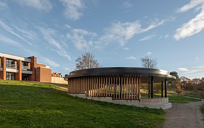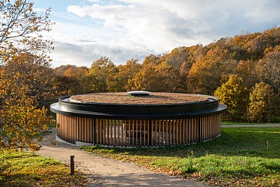 Paviljongen og bålplassen er to sirkulære konstruksjoner som skaper et unikt utemiljø som er vakkert integrert i det bølgende landskapet.