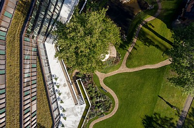 Landskapet rundt Carlsbergs hovedkontor er en videreføring av stedets lange historiske tradisjon for å knytte sammen bygninger, hager og landskap. Bygningen er flettet sammen med den fredede eksisterende hagen med et tilpasset og skånsomt uttrykk der bygningsgeometri og terrasser tilpasser seg terrenget og hagens store og fredede trær. Kildens historiske betydning for Carlsberg er tolket som et nytt, karakteristisk og funksjonelt landskapselement som tilfører brygger Jacobsens gamle, romantiske hage nye sosiale og rekreative dimensjoner. Det nye skulpturelle vannelementet «Kilden» er plassert mellom nytt og gammelt, hage og bygning, og markerer på en skånsom måte møtet mellom hovedkontorets oppholdsområder og den fredede hagen. Dermed forvandles hagen til et offentlig rekreativt pusterom og føres inn i en ny tid med en høyere grad av offentlighet og bruk, der klimatilpasning og tilgjengelighet flettes sammen med stedets kulturarv.