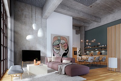 Høye rom med en minimumshøyde på fire meter skaper en luftig og romslig atmosfære. Kontrasten mellom rammene i rå betong og varme materialer som tre, skaper en unik stemning som definerer hvert rom.