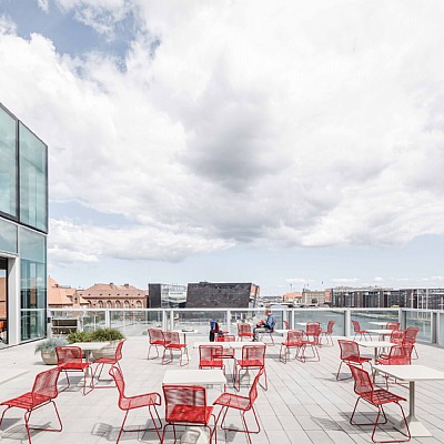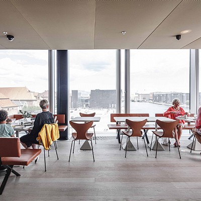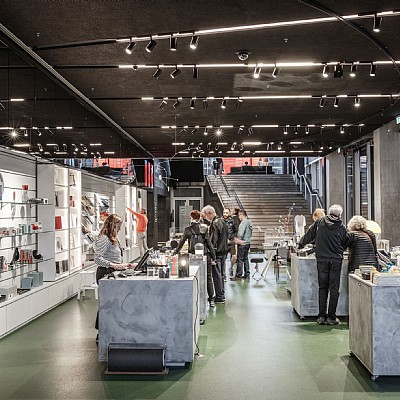 DAC has relocated to the new BLOX, which stands in great contrast to the historic warehouse Gammel Dok Pakhus, which they occupied earlier. Here, a new connection between shop, exhibition and café has been created and a working environment with a unique, visual contact with the building's visitors has been developed. With the title "Living the brand", the interior reflects DAC's work and culture and takes into account public access and visitors of all age groups.