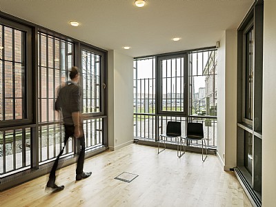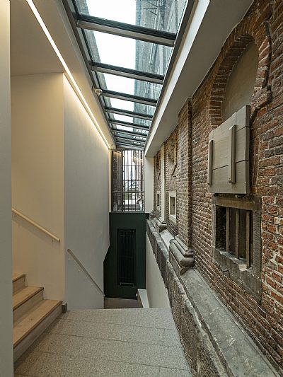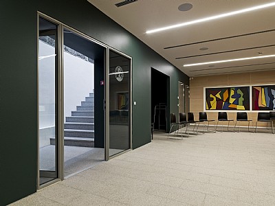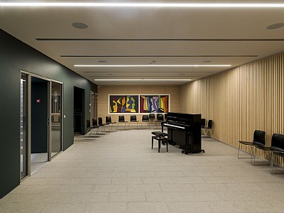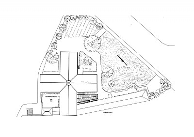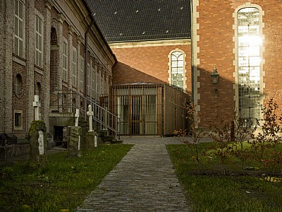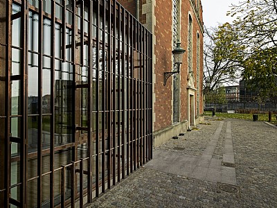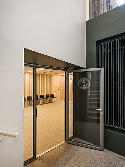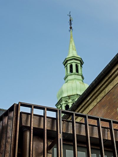 Det enkle tilbygget i to etasjer rommer kontorer og fellesrom for medarbeiderne på bakkeplan og en menighetssal i underetasjen med plass til 85 tilhørere. Menighetssalen får tilført overlys via smale lysspor i taket, og veggene kles med treverk. Bygningen har samme høyde som sin forgjenger, og fasade og tak består av kobber formet som et gitter som er holdt ut fra den innvendige fasaden. Den moderne utformingen viser respekt for stedet: Kobberet er inspirert av kobbertaket i "Lille Skriftestol", og åpningene i gitteret går igjen i vindussprossene på de høye vinduene i kirken.