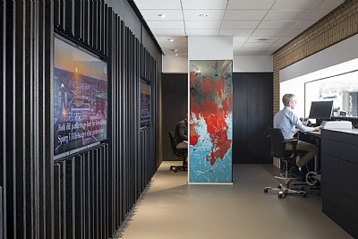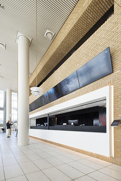 Billettkontoret er holdt i sort og hvitt, og det har digitale informasjonsskjermer, LED-belysning og enkelte fargereferanser til Musikhusets saler og historie. Det er lagt vekt på både detaljer og helheten.