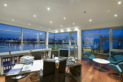 Byggnaden består av en kontorsdel samt ca. 1200 m² verkstad och lager. Administrations- och servicebyggnaden är utformad diskret med referenser till den maritima världen; grundelementen – däck, reling, kommandobrygga, lejdare – ingår i konceptet, utan att helheten därför liknar ett fartyg. Byggnaden omfattar, trots sin ringa storlek, tre våningar, detta för att man ska kunna njuta maximalt av det fantastiska läget och utsikten. Ett gemensamt rekreationsställe är ”fartygsdäcket”, d.v.s. takterrassen på första våningen, som avslutas med ett stort trapparti med panoramautsikt utöver Aarhusbukten.