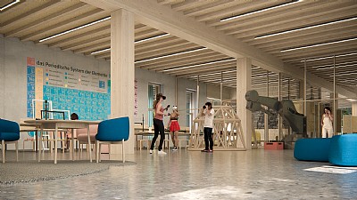 Den sexklassiga grundskolan fungerar även som en central punkt i det lokala distriktet, med samhällsorienterade funktioner som bibliotek, ungdomscenter, musikrum och verkstäder. Byggnaden kan även användas flexibelt av lokalbefolkningen både under och utanför skoltid.