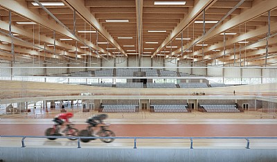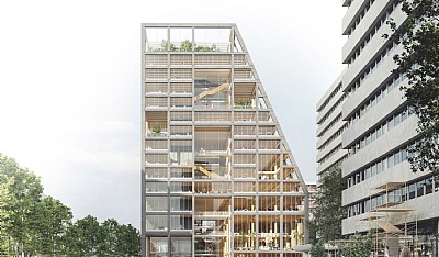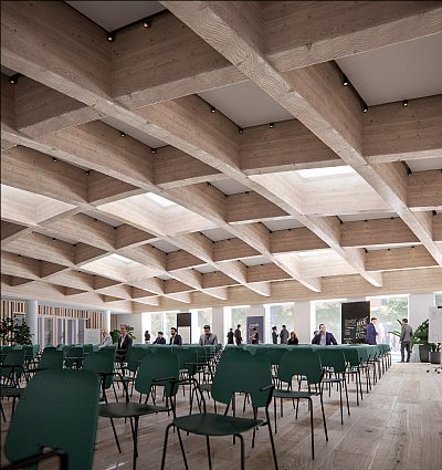 Byggnaden är konstruerad med bärande träkonstruktioner, vilket avsevärt minskar byggnadens kolinnehåll och miljöpåverkan.