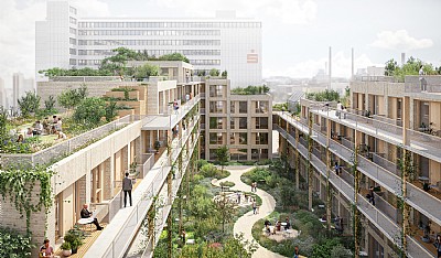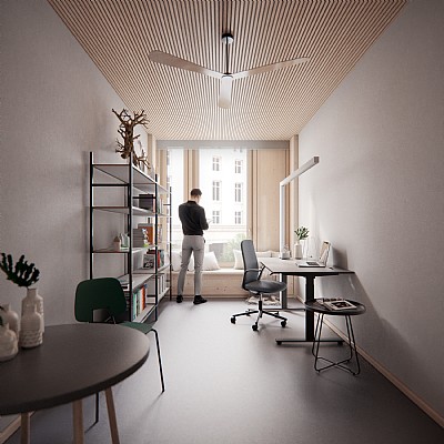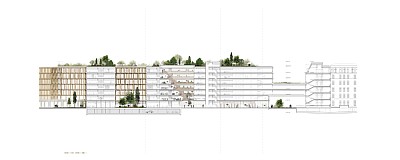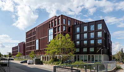 En del av komplexet skapar en komplettering och omtolkning av ett befintligt stadskvarter som innehåller BMUKN-enheter, som ett elegant tillägg klätt i natursten och med integrerade solcellspaneler i fasaden.