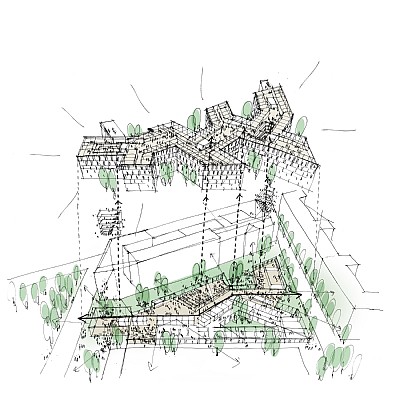 Vid sidan av det befintliga kvarteret skapas en ny, dynamisk byggnadsform. Utgångspunkten är den klassiska och funktionella kontorslayouten, som har optimerats med tanke på dagsljus, naturlig ventilation och byggnadsformer för att skapa utmärkta möjligheter att ta tillvara dagsljus och skapa vackra omgivningar för kontorsutrymmena. Byggnaden öppnar sig mot den omgivande staden och kopplar samman gröna innergårdar via en grenformad struktur med den yttre perimetern, för att släppa in frisk luft och skapa åtkomst till gröna ytor.