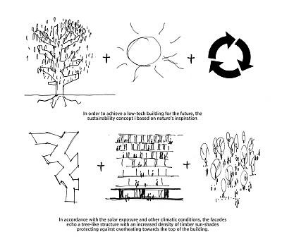 Byggnadens fasad inspireras av den varierande tätheten hos trädkronor, som en del av en mångfacetterad hållbarhetsstrategi baserad på enkel teknik, vilket minskar byggnadens CO2-avtryck och förbättrar komforten för användarna. Genom att integrera solcellspaneler i fasaden på en av byggnadens delar kan taket istället användas för att skapa en generös grön takträdgård som tillsammans med de gröna innergårdarna understryker ministeriets miljöambitioner och det positiva bidraget till stadsbilden.