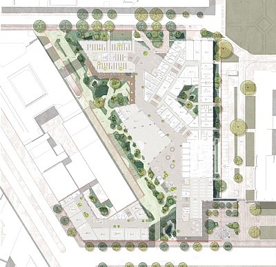 Belägen på en historisk plats i centrala Berlin har tanken varit att skapa en grön och öppen komposition av byggnader för att ge platsen en ny kvalitet, men som samtidigt uppfyller mycket höga krav på hållbarhet, säkerhet och integration av historiska monument och utomhusfaciliteter.