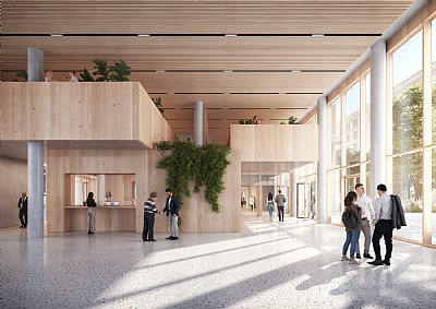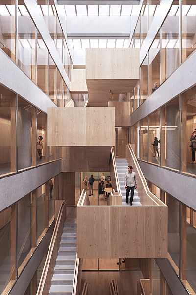 Innergårdarna fungerar som noder inne i byggnaden via fyra glasklädda atriumutrymmen med öppna trappor som förbinder bottenvåningen med de övre kontorsvåningarna och en takträdgård. På varje våning skapar ett loungeområde mötesplatser för raster och utbyte av kunskap och idéer i respektive kontorssektion. Detta tillsammans med ett konferenscenter och bibliotek på bottenvåningen utformat för att även fungera som ett alternativ för ”nya arbetssätt” ger extra flexibilitet i enlighet med olika användare över tid.