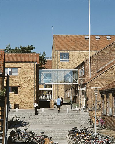 Byggnaderna består av låga, inbördes förskjutna block på en till två våningar. De är förbundna med glaskorridorer, och sluter sig runt olika gårdsrum och uppehållsutrymmen. Ett noggrant planerat trafiksystem ser till att gångytor och passager leder både lärare och studerande ut till undervisningslokalerna, medan torg och öppna platser i stället samlar husets användare runt gemensamma funktioner som stora auditorier, caféer och receptioner. Fasadernas genomgående flammiga tegelväggar och röda takpannor bidrar till att ge skolan en helhetskänsla, samtidigt som de knyter an till resten av C.F. Møllers institutionsbyggnader längs allén.