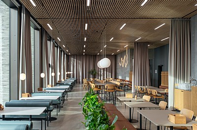 The interior contributes to the overall architectural identity by creating a friendly and open space for the community at Katrinebjerg — a place where people meet, study, collaborate, and exchange ideas. The project nods to local design by incorporating furniture and lighting from Aarhus-based brands.