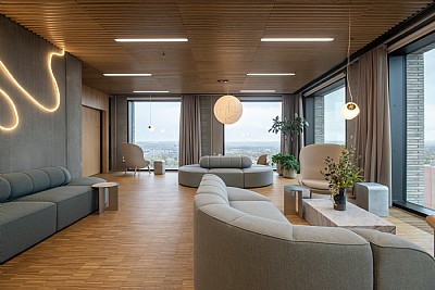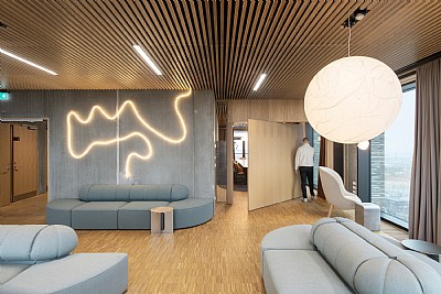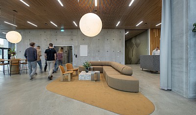 The assignment for the IT/tech hub Katrinebjerg, with a network of over 100 companies, commenced with an initial study of functionality, flow, zoning and wayfinding and completed with a full interior design addressing colors, materials, furniture and bespoke fittings for all common areas — including the atrium, reception, restaurant, meeting and event facilities, and smaller shared zones such as kitchenettes and lounges.