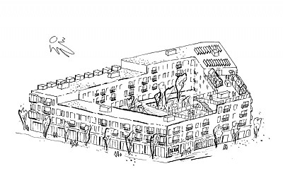 Gården ovanpå parkeringsplanet inbjuder till många olika former av gemenskap och lek, från sandlådor till sittplatser och sinnesträdgårdar. Boende har dessutom tillgång till två stora takterrasser och de omkringliggande landskapsrummen. Gården är uppdelad i fyra öar förbundna med ett slingrande stignät med bänkar och lekutrustning som skapar lugn och privatliv kring terrasserna.