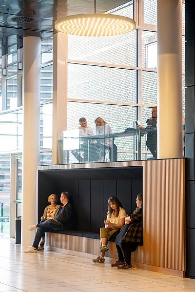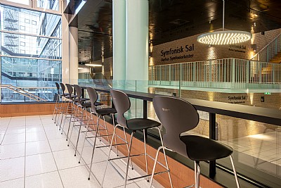 I och med utvidgningen av den nya nedre foajén har olika zoner skapats så att gästerna kan vistas i olika miljöer och samtidigt vara en del av foajén. Den nya baren är en del av rummet i slutet av gångvägen och skapar en intim baratmosfär med bord och höga stolar med utsikt över den nedsänkta foajén. En mjuk miljö har skapats i övergången mellan baren och foajén med vadderade och omslutande sittplatser klädda i ekpanel. På samma sätt finns det stoppade bänkar i vitt stål och ek längs glasfasaden mellan pelarna i foajén. En bred trätrappa som förbinder den ursprungliga gången med den nedsänkta foajén har förlängts för att ytterligare förbinda de olika sittplatserna, baren och salarna.