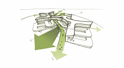 Sjukhuset växer ut ut landskapets skogsglänta. Vårdbyggnaderna med ljusgårdar och vackra trädgårdar utgör en grön bakgrund mot sängbyggnaderna som reser sig över sjukhusets gröna, tillgängliga tak.