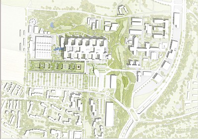 För att undvika att det befintliga, K-märkta sjukhuset skyms för mycket har en stor del av utbyggnaden förlagts under jord. Utbyggnaden täcks av ett lummigt parklandskap som är öppet för både allmänheten och sjukhusets personal och blir det första man möts av när man kommer till sjukhuset. Den låga byggnaden reser sig uppåt i en svängande rörelse mot den offentliga ankomsthallen, som tillsammans med utsikt över det gröna parklandskapet skapar en vänllg och välkomnande ankomst och intuitivt leder patienter och anhöriga på rätt väg.